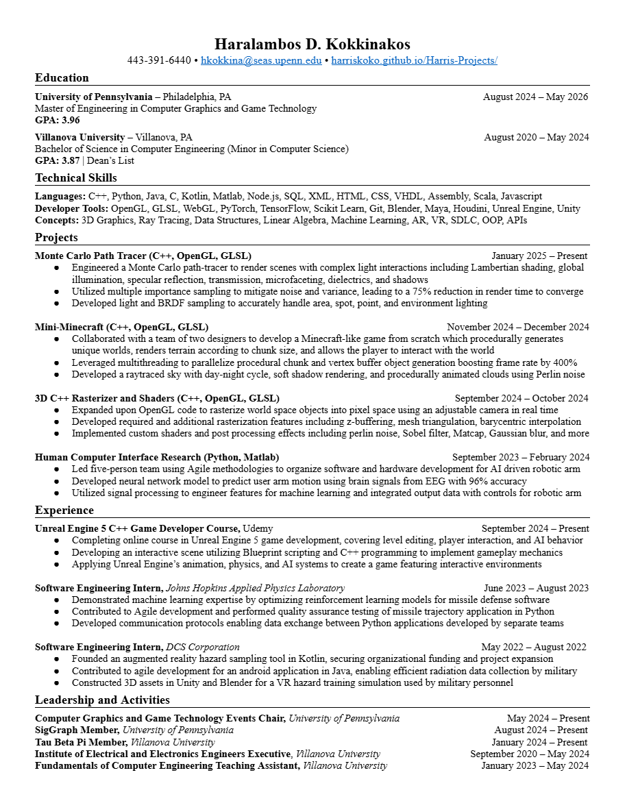 I'm currently pursuing my Masters Degree at the University of Pennsylvania in Computer Graphics and Game Technology after finishing my undergraduate degree in Computer Engineering at Villanova University