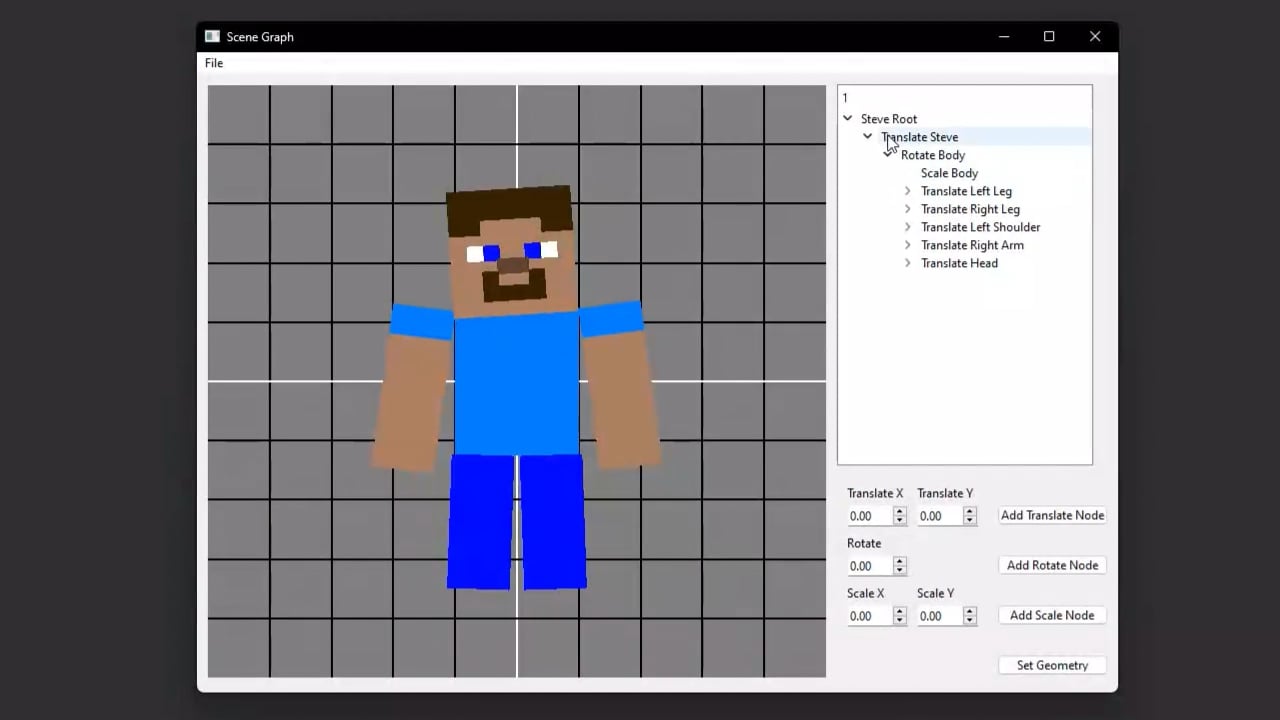The video above shows a 2D model of a character I designed by creating polygons and applying transformations including translation, rotation, and scaling. This model can then be modified in the GUI editor by the user.