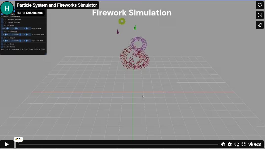 direction upwards. The firework and its particles generated are always affected by gravity. We can also introduce more forces such as drag, wind, attraction repulsion, and random forces.